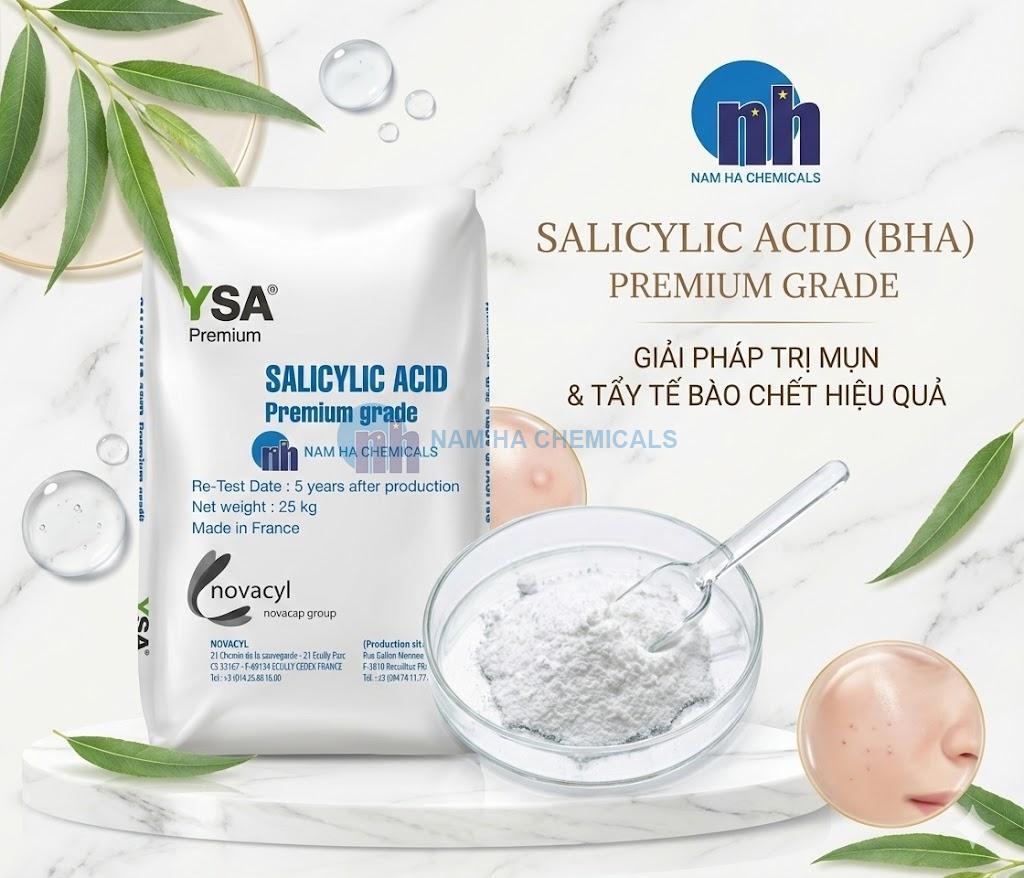 100g/gói, 500g/gói, 1kg/gói, 25kg/baoAcid Salicylic (BHA) - Novacyl, nhập khẩu chất lượng cao tại Nam Hà Chemicals. Hoạt chất vàng giúp trị mụn, sạch sâu lỗ chân lông và kháng viêm. Cung cấp sỉ lẻ giá tốt, đầy đủ COA.