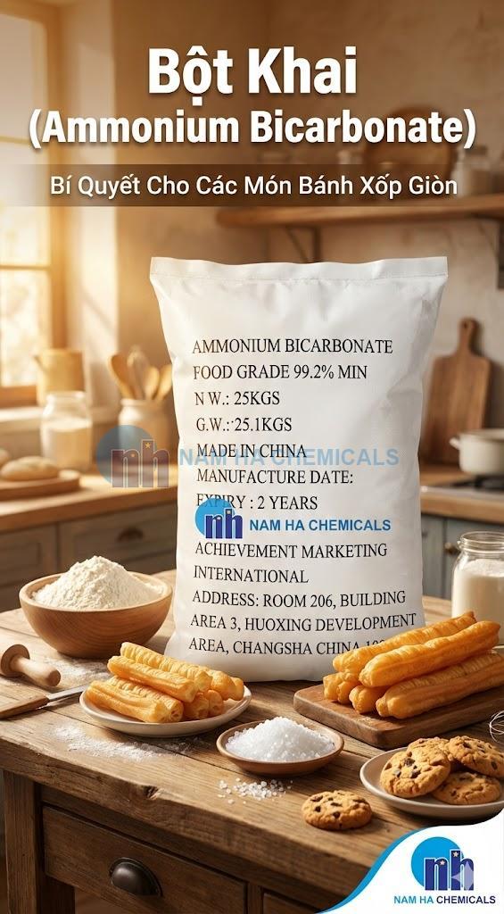 25kg/baoTổng kho Bột Khai (Ammonium Bicarbonate - E503ii) thực phẩm. Bí quyết giúp bánh bao, quẩy, bánh nướng nở to, xốp rỗng, giòn tan. Hóa chất tạo xốp cao su/nhựa. Bao 25kg giá sỉ.