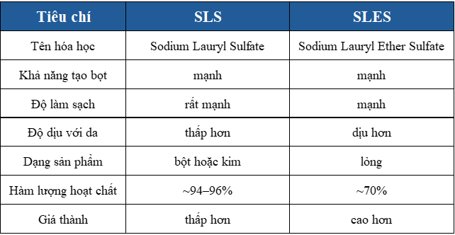 Cả hai đều có chức năng tạo bọt và làm sạch, nhưng đặc tính và mức độ dịu nhẹ của chúng có sự khác biệt. Việc lựa chọn SLS hay SLES phụ thuộc vào mục tiêu công thức và loại sản phẩm cần sản xuất.