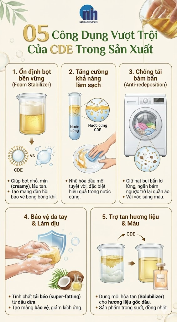 Cam kết của Nam Hà: Chúng tôi phân phối dòng CDE từ các nhà sản xuất uy tín (Thái Lan, Malaysia - như BASF, Cognis, KAO...) với công nghệ tổng hợp tiên tiến, đảm bảo hàm lượng DEA tự do ở mức tối thiểu, an toàn cho người sử dụng và đáp ứng các tiêu chuẩn xuất khẩu.