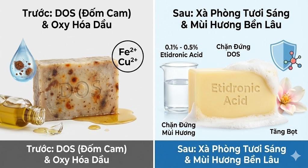 Chặn đứng DOS: Khóa chặt kim loại, ngăn chặn quá trình oxy hóa dầu. Bánh xà phòng giữ được màu sắc tươi sáng, không bị đốm cam dù để cả năm trời.