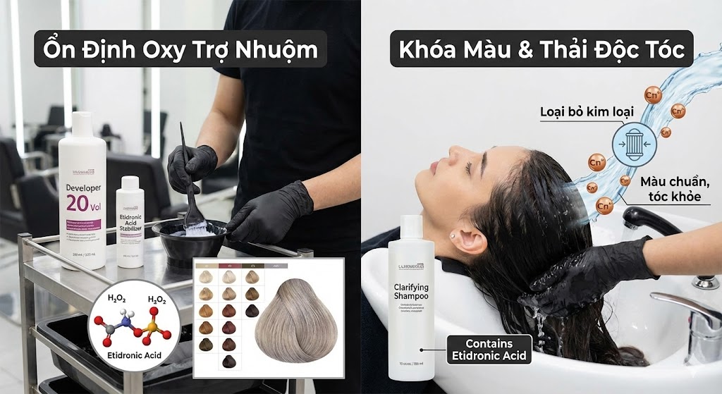 Trong các Salon chuyên nghiệp, Etidronic Acid là thành phần không thể thiếu nhưng ít ai để ý trong các chai Oxy trợ nhuộm (Developer) và Dầu gội.