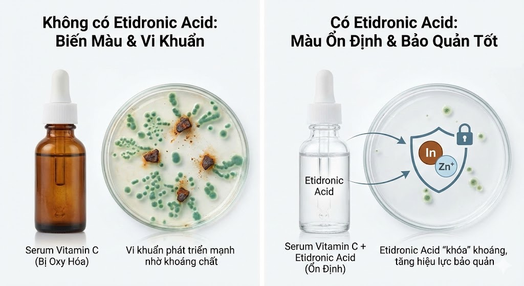 Chỉ một lượng siêu nhỏ ion Sắt cũng có thể làm Serum Vitamin C chuyển màu vàng sậm và mất tác dụng. Etidronic Acid hoạt động như một lớp khiên bảo vệ, giúp hệ nền của kem/serum ổn định màu sắc và độ trong suốt.