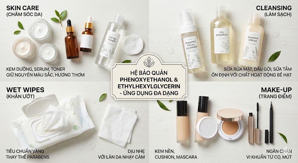 Trong Sản phẩm chăm sóc da (Skin Care), đây là lựa chọn số 1 cho các loại kem dưỡng (Creams), sữa dưỡng (Lotions), Serum và Toner. Đặc tính không màu, mùi nhẹ (gần như không mùi) của nó giúp giữ nguyên vẹn hương thơm tinh tế và màu sắc tự nhiên của sản phẩm. Đặc biệt đối với các loại kem dưỡng ẩm chứa nhiều nước và dưỡng chất – môi trường cực kỳ dễ nhiễm khuẩn – sự mạnh mẽ của hệ bảo quản này là tấm khiên bảo vệ không thể thiếu.