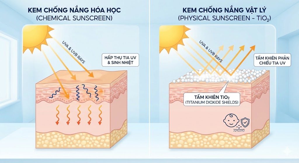 Trong khi các màng lọc hóa học (như Oxybenzone, Avobenzone, Octinoxate) hoạt động theo cơ chế hấp thụ tia UV, biến đổi năng lượng tia cực tím thành nhiệt năng rồi giải phóng qua da; thì màng lọc vật lý TiO2 hoạt động như một hàng vạn tấm gương phản chiếu siêu nhỏ. Khi bạn thoa kem chống nắng vật lý, TiO2 nằm trên bề mặt lớp sừng của da. Ngay khi tia UVA và UVB chiếu tới, các hạt TiO2 sẽ tán xạ và phản xạ các tia này bật ngược trở lại môi trường, không cho chúng có cơ hội xuyên thấu vào biểu bì để bẻ gãy các sợi Collagen hay gây đột biến DNA.