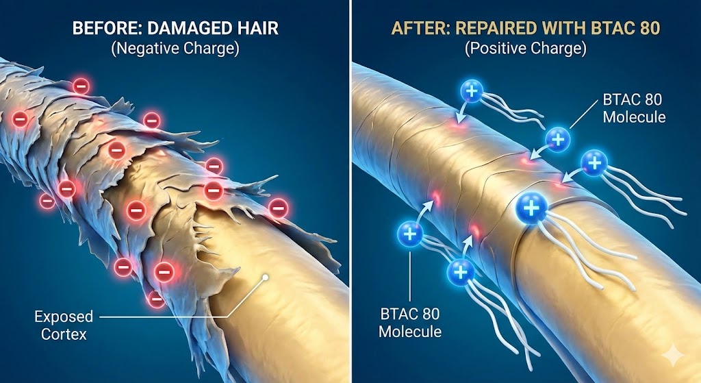 Tóc hư tổn thường mang điện tích Âm (-) do các nhóm acid amin bị lộ ra. BTAC mang điện tích Dương (+). Theo nguyên lý trái dấu hút nhau, BTAC sẽ bám chặt lấy các vùng tóc bị hư tổn nhất, lấp đầy các khoảng trống trên lớp biểu bì (cuticle).
