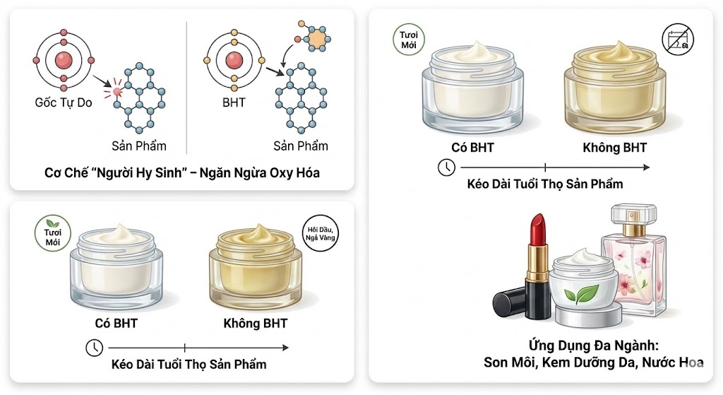 BHT hoạt động như một "người hy sinh". Nó phản ứng với các gốc tự do (nguyên nhân gây oxy hóa) trước khi các gốc tự do này kịp phá hủy các thành phần trong sản phẩm của bạn.
