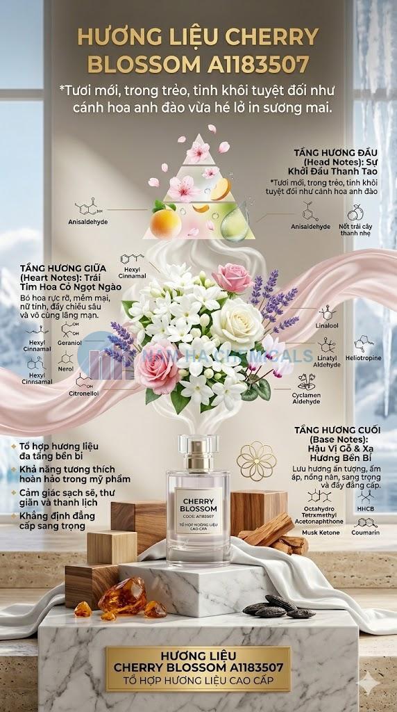 Thông Số Kỹ Thuật Đạt Chuẩn Chuyên Nghiệp Mã hương Cherry Blossom A1183507 đáp ứng đầy đủ các tiêu chuẩn kỹ thuật khắt khe cho quy trình sản xuất mỹ phẩm chuyên nghiệp: