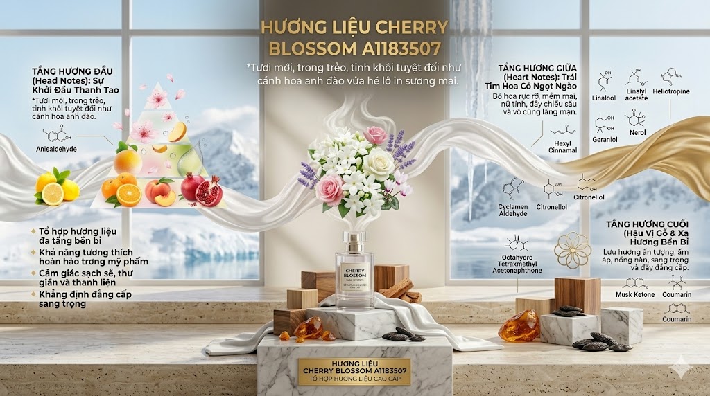 Phân Tích Cấu Trúc Đa Tầng Của Hương Cherry Blossom Sức hấp dẫn của Cherry Blossom A1183507 nằm ở sự phối trộn bậc thầy giữa các hợp chất thơm, tạo nên một hành trình mùi hương đầy mê hoặc: