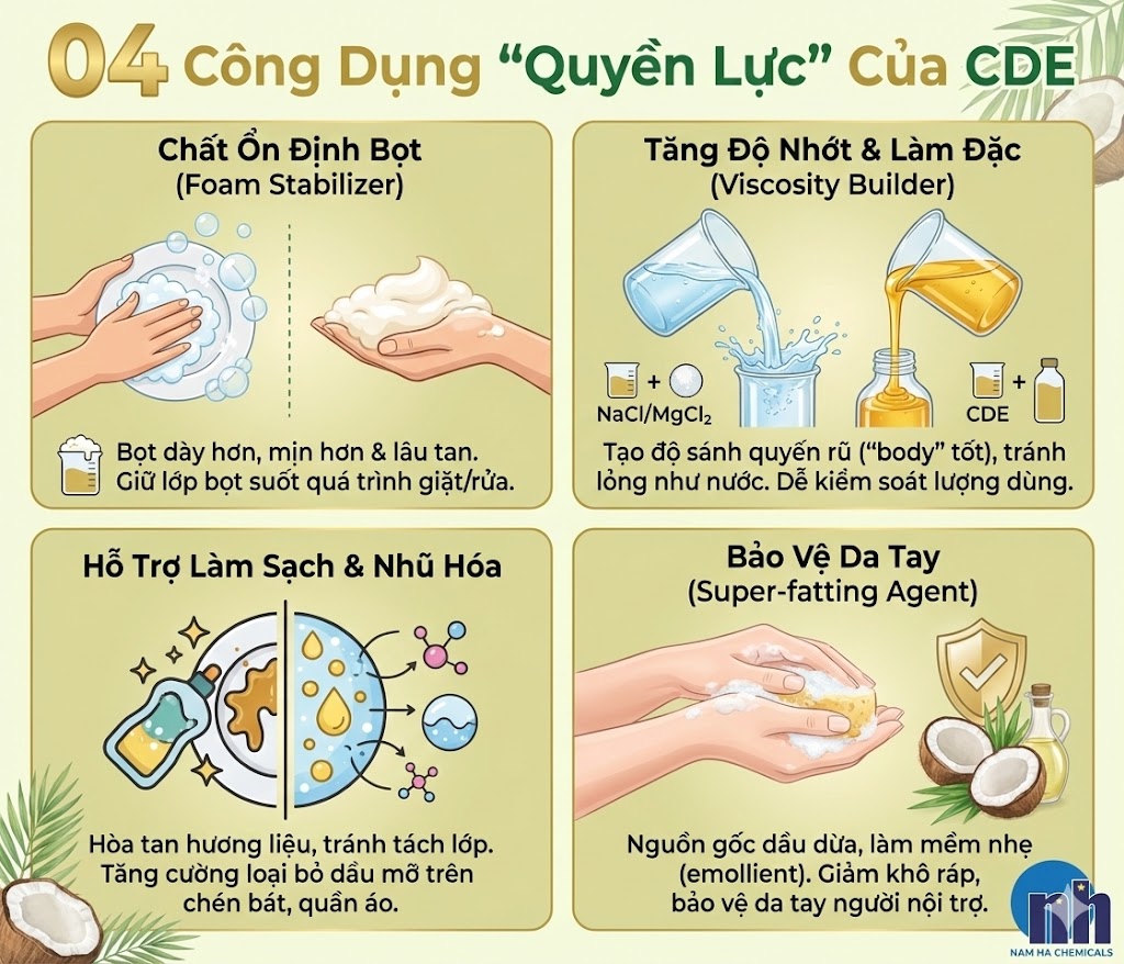 Các chất tạo bọt chính (như LAS, SLES) tạo bọt rất tốt nhưng bọt thường to và nhanh vỡ. CDE giúp cấu trúc bọt trở nên dày hơn, mịn hơn và lâu tan hơn. Nó giữ cho lớp bọt tồn tại suốt quá trình giặt/rửa, tăng sự hài lòng của người dùng.