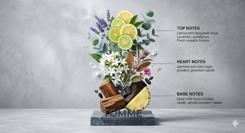 Hương Đầu (Top Notes) - Sự Bừng Nổ Sảng Khoái: Ngay từ khoảnh khắc đầu tiên, Tomme M01 đánh thức mọi giác quan bằng sự tươi mát rực rỡ của cam chanh (Limonene, Citral) quyện cùng nốt hương thảo mộc đặc trưng từ tinh dầu oải hương (Linalool, Linalyl Acetate). Sự góp mặt của tinh dầu khuynh diệp (Eucalyptol) và nốt xanh từ 2,6-dimethyloct-7-en-2-ol mang lại cảm giác mát lạnh, trong lành như một luồng gió biển.