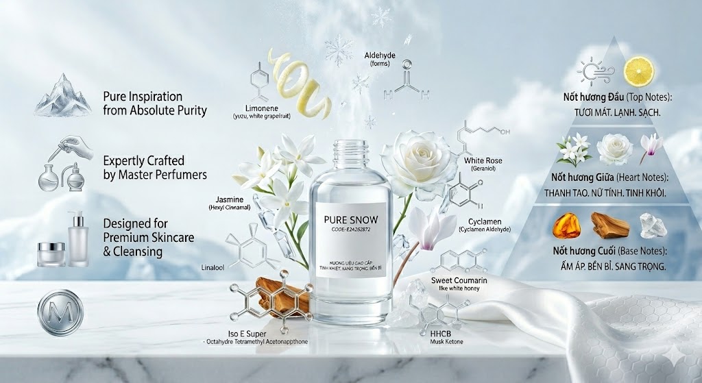 ** Ứng Dụng Đa Năng Trong Ngành Công Nghiệp Hóa Mỹ Phẩm** Với tông hương "Sạch & Sang", Pure Snow E24282872 là chìa khóa để tạo nên các dòng sản phẩm dẫn đầu xu hướng: