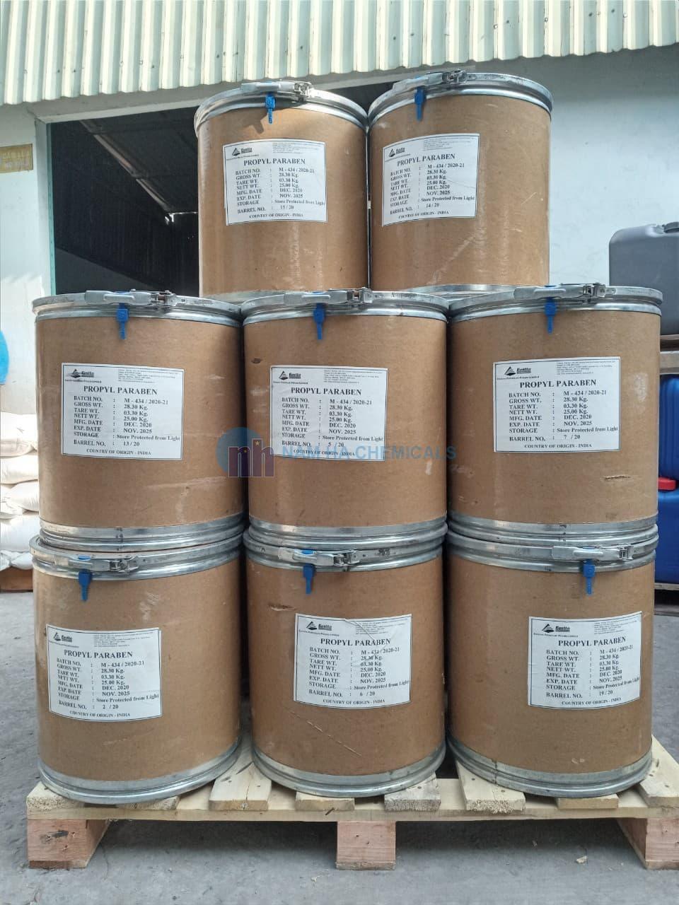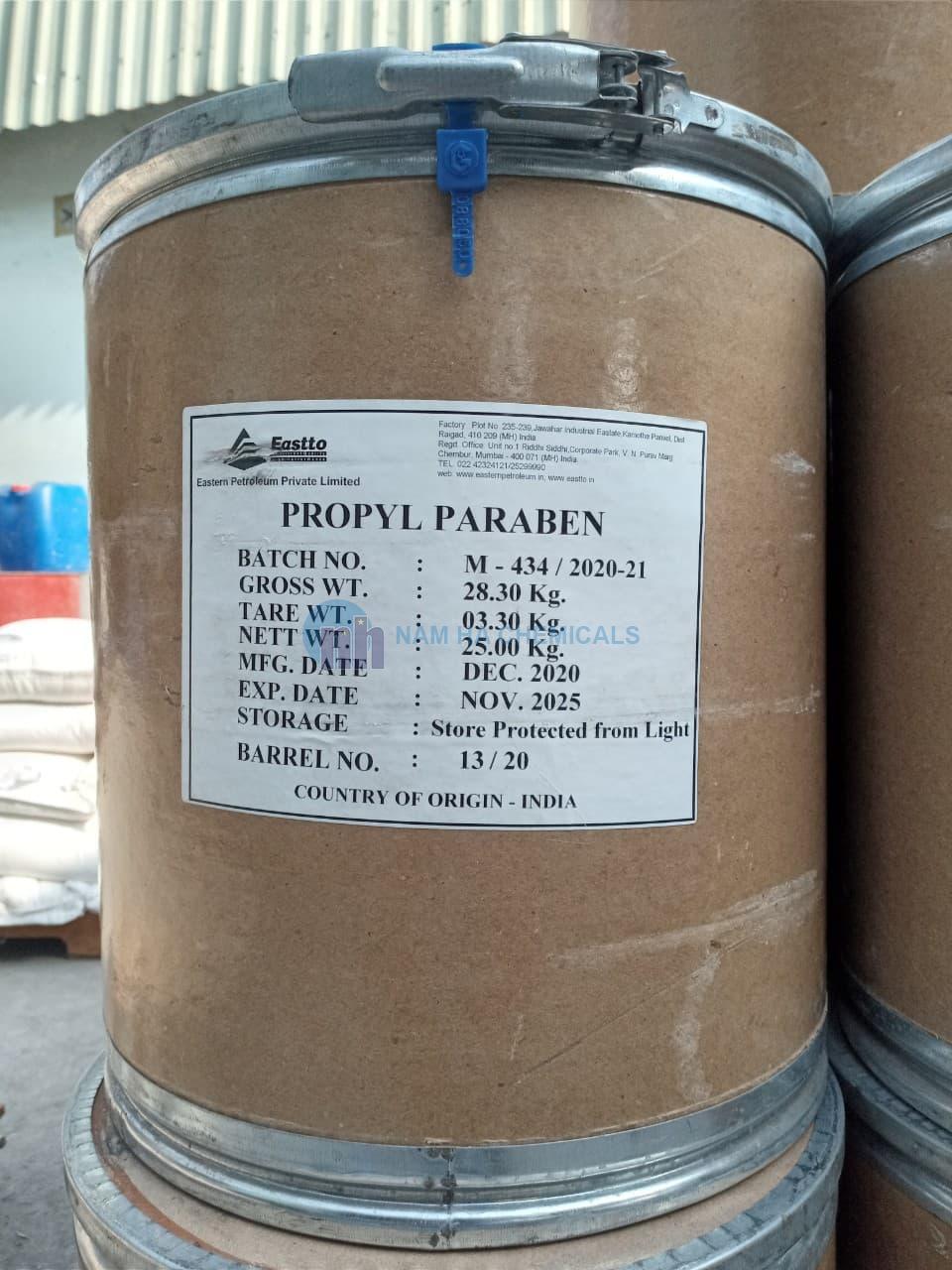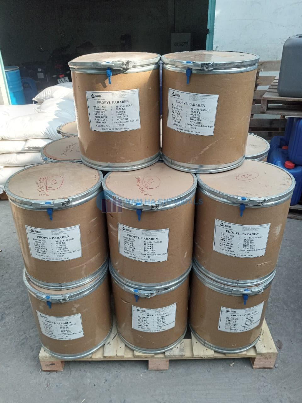 PropylParaben có dạng bột màu trắng, không mùi. Propyl Paraben là chất bảo quản được sử dụng rộng rãi trong mỹ phẩm, thông thường các gốc paraben được phối lại với nhau để giảm liều lượng đồng thời tăng khả năng kháng khuẩn và kháng nấm cho sản phẩm.