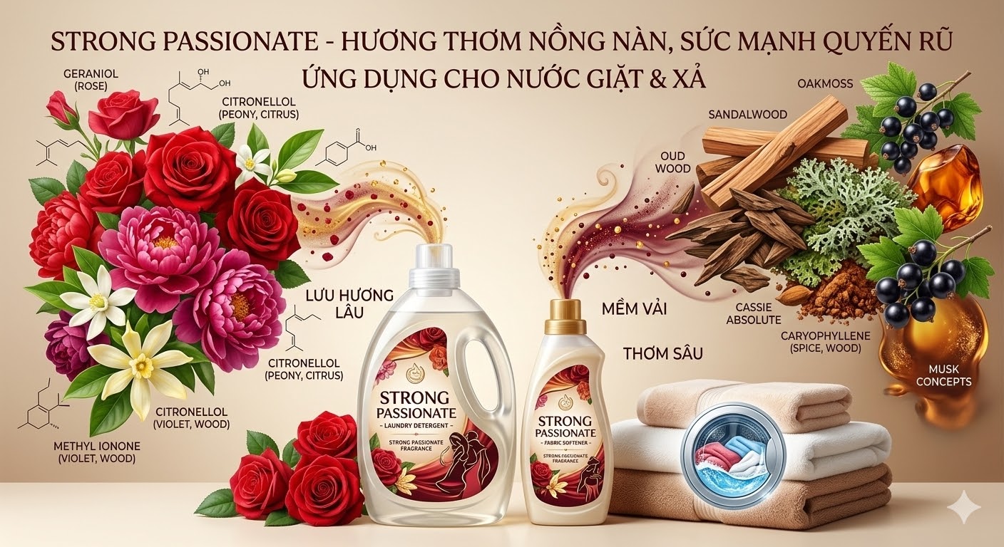 Đây là một tổ hợp hương tinh vi, được thiết kế để mang lại một dấu ấn khứu giác mạnh mẽ, bền bỉ, phù hợp hoàn hảo cho các dòng mỹ phẩm và nước hoa nam cao cấp. Với cấu trúc tầng hương đa diện, Strong Passionate không chỉ là một mùi hương, mà là một lời tuyên ngôn về phong cách sống tự tin và tràn đầy đam mê.