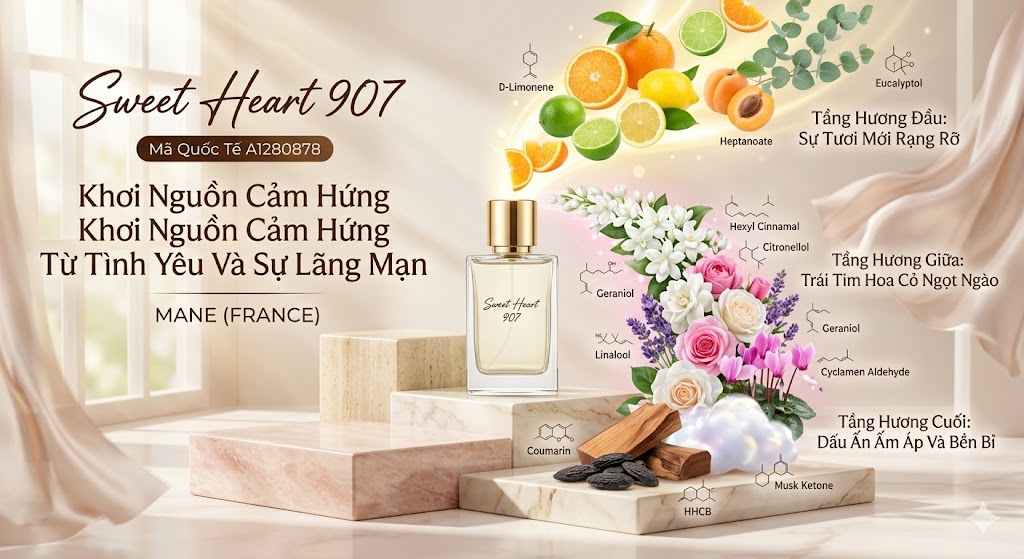 Phân Tích Cấu Trúc Đa Tầng Của Sweet Heart 907 Sức hấp dẫn đặc biệt của Sweet Heart nằm ở sự chuyển mình nhịp nhàng giữa các lớp hương đầy màu sắc, tạo nên một hành trình khứu giác hoàn mỹ: